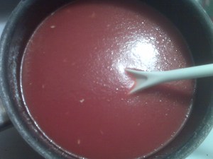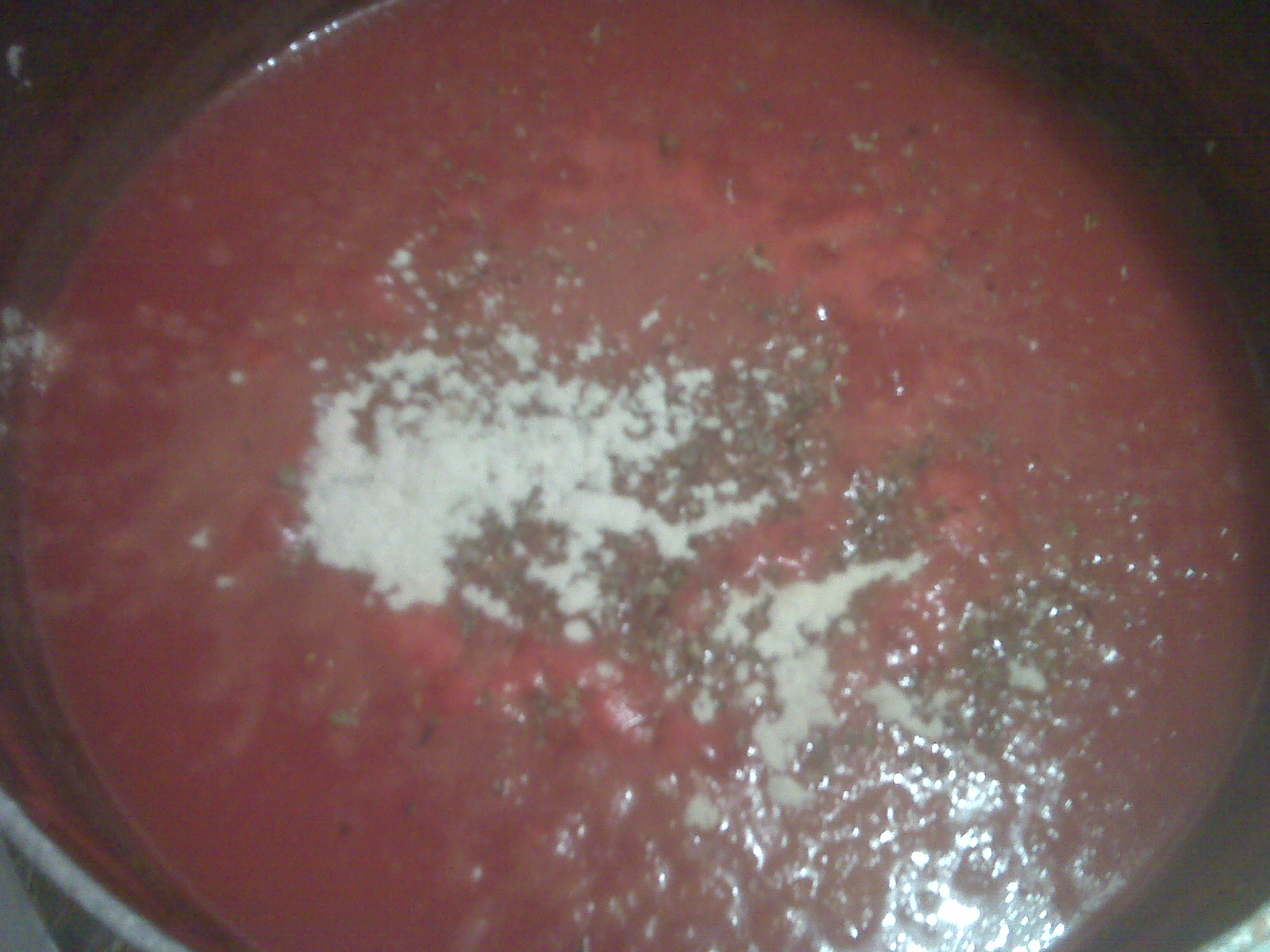 Skim the foam off. I usually keep the tomato sauce can on the stove just for this purpose. You can dump the foam in there. Continue to boil until it no longer foams – about 15 minutes or so – and stir. After you’ve skimmed the sauce, you can add garlic powder. Allow it to simmer another 15 minutes and add other desired seasonings to taste–onion powder and Italian seasonings.