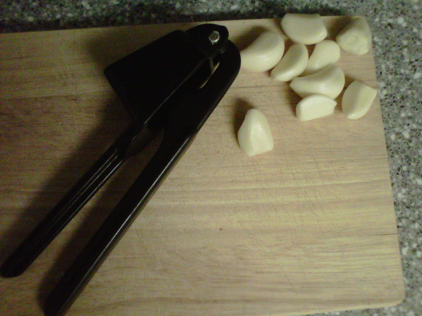 *Note: the minced garlic can be found in a jar at the store so you don’t have to mince a clove or two of garlic yourself. Keep it in the refrigerator. I prefer fresh garlic and enjoy the hell out of my garlic press. And as you can see from the multiple cloves sitting on that cutting board, I love garlic! =)