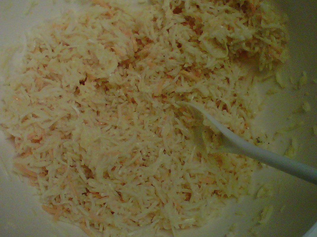 Once the hamburger is ready, stir it into the sauce and let it simmer. While that’s simmering, you can prepare the cheeses. Now, I’ve given you measurements to go by, but honestly, I just eyeball it and use my hands. Use about 3/4ths of the cheeses and mix them together in a large bowl with the 3 eggs. This will be your cheese layer.