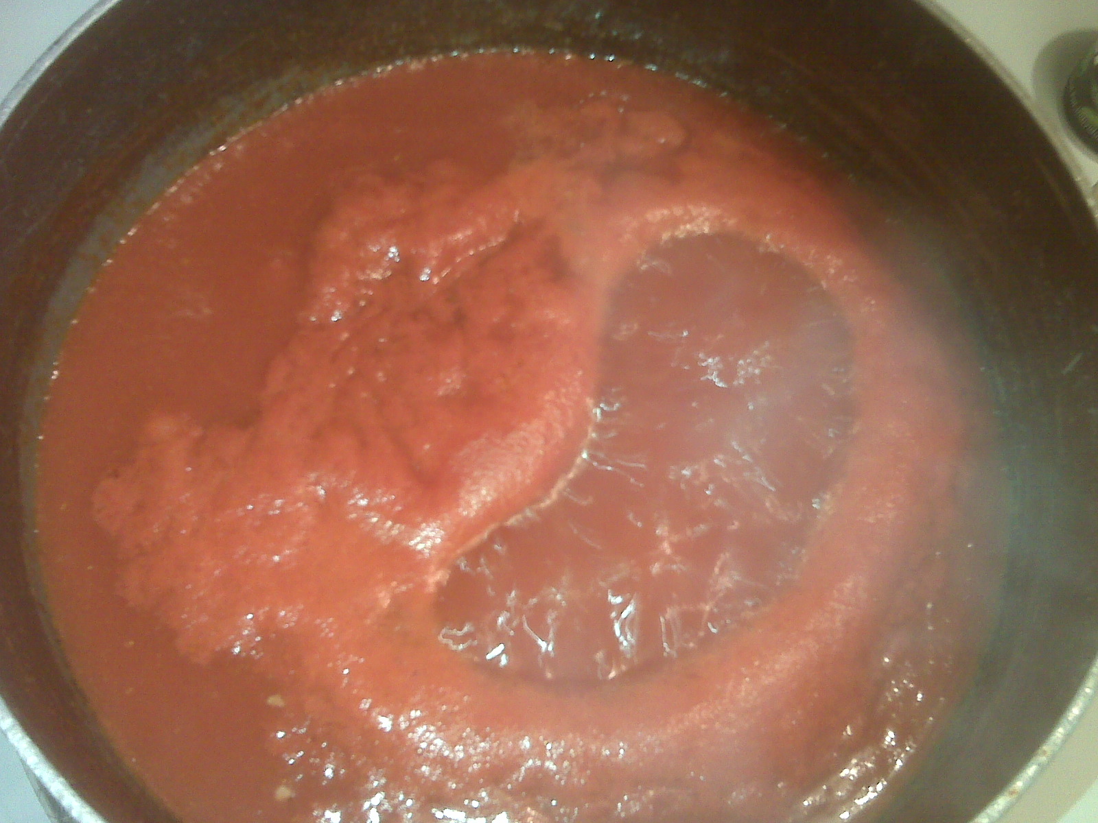 Skim the foam off. I usually keep the tomato sauce can on the stove just for this purpose. You can dump the foam in there. Continue to boil until it no longer foams – about 15 minutes or so – and stir. After you’ve skimmed the sauce, you can add garlic powder. Allow it to simmer another 15 minutes and add other desired seasonings to taste–onion powder and Italian seasonings.