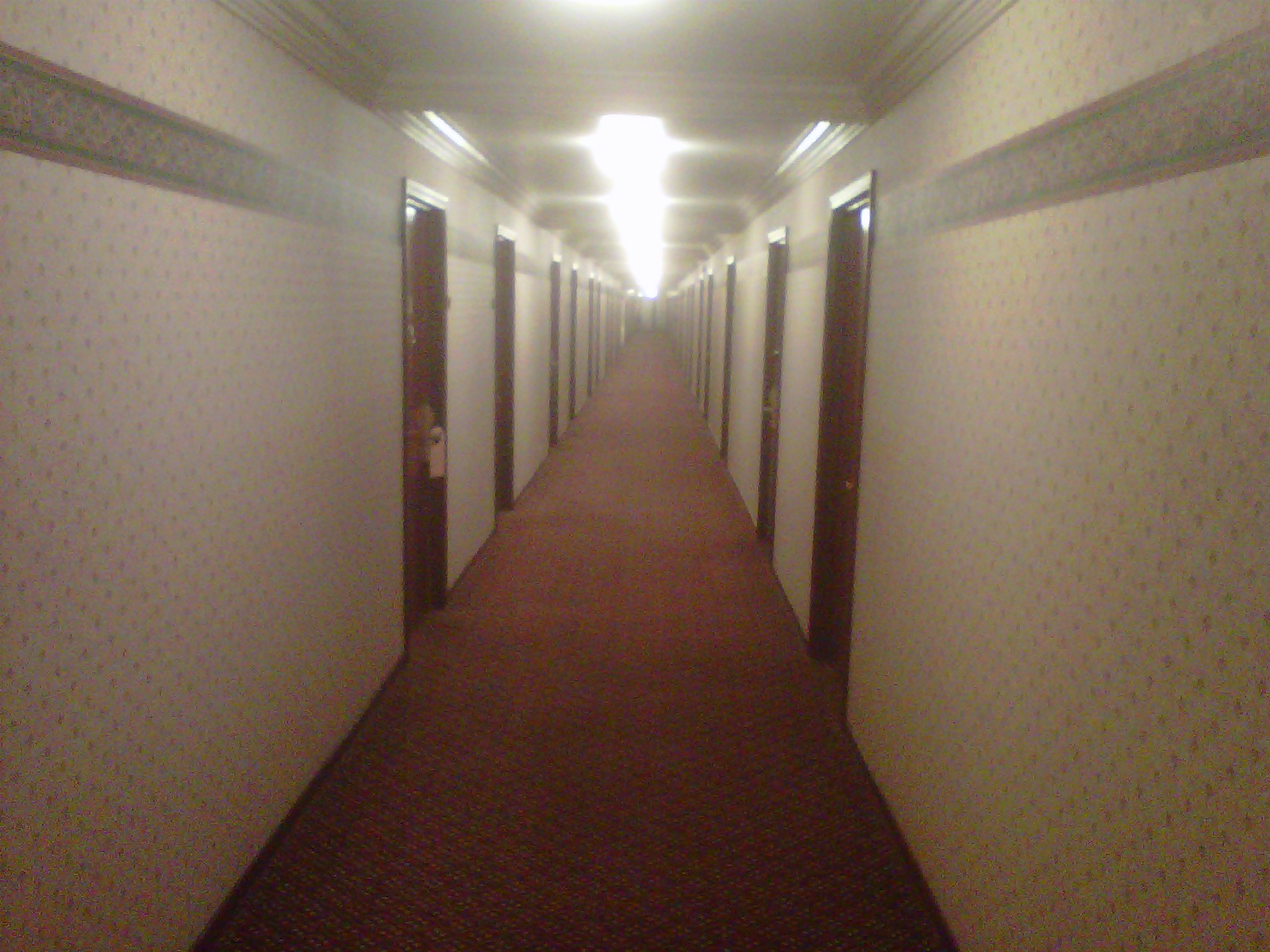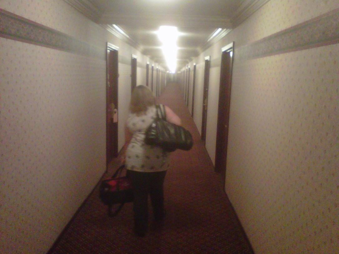 Yeah, tell me that doesn’t SHOUT “The Shining” to you! I know, right? Our room was the VERY LAST ONE. With each passing evening upon our return (and usually after having several drinks), this view became quite hilarious. To give you a bit of perspective, here’s Juliette starting to walk down the hallway Thursday night.