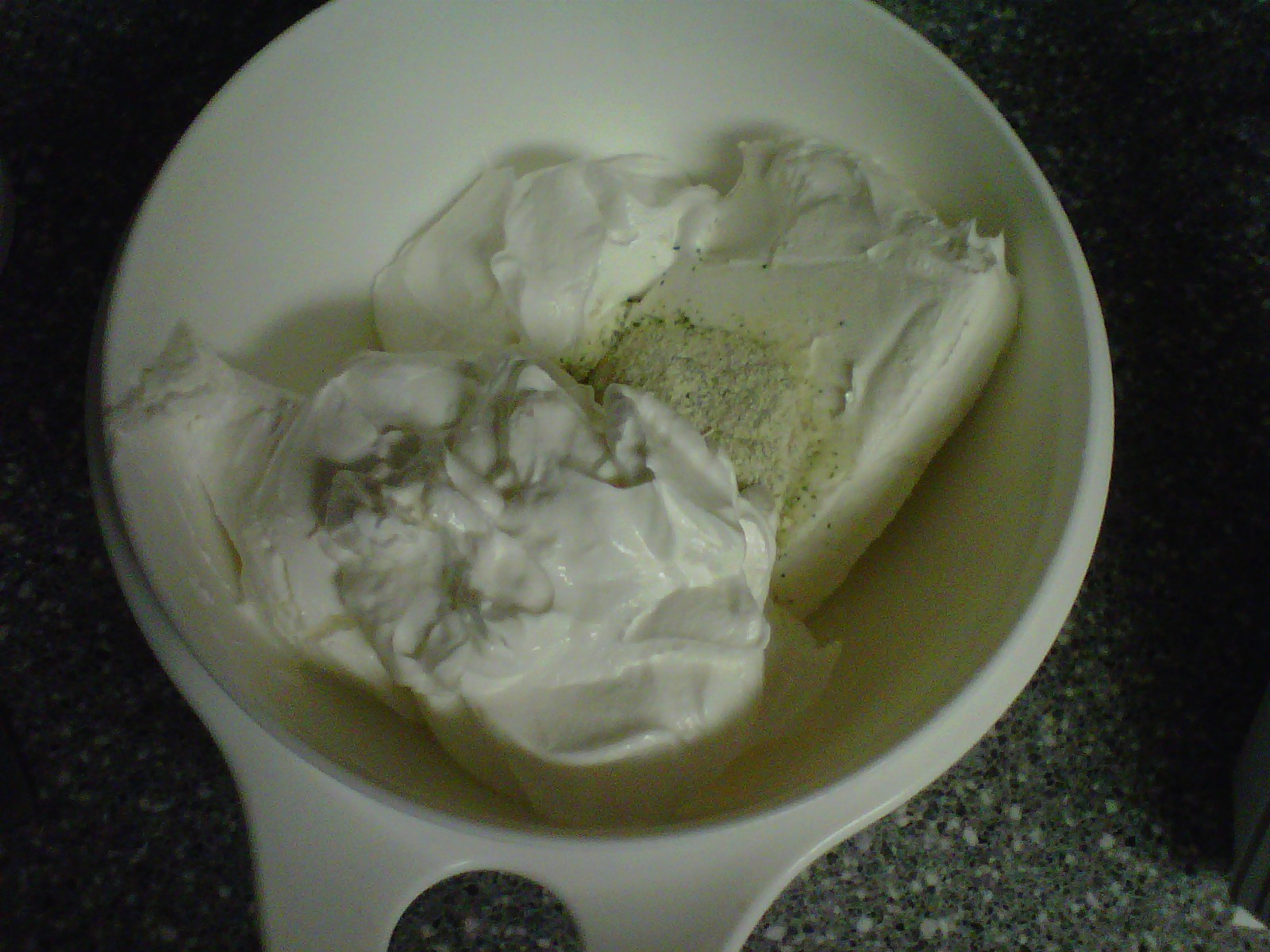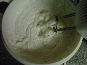 I empty the packet contents first into a small/medium bowl. This way the powdery substance is on the bottom once you start mixing. Yeah, you see where I’m going with that, don’t you? Next I add the cream cheese and then the sour cream. This works best if you set the cream cheese out for at least 30 minutes to soften it up. It’s easy to break down and mix that way.