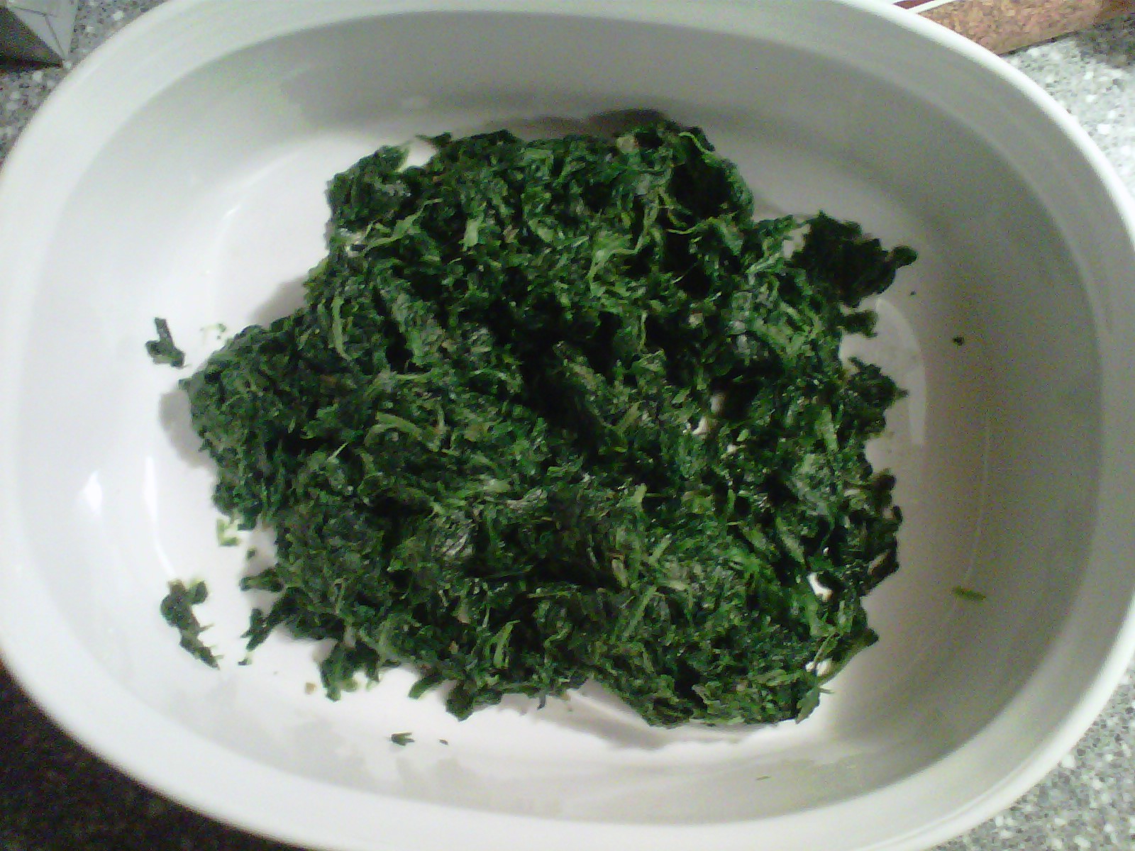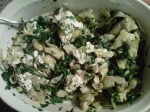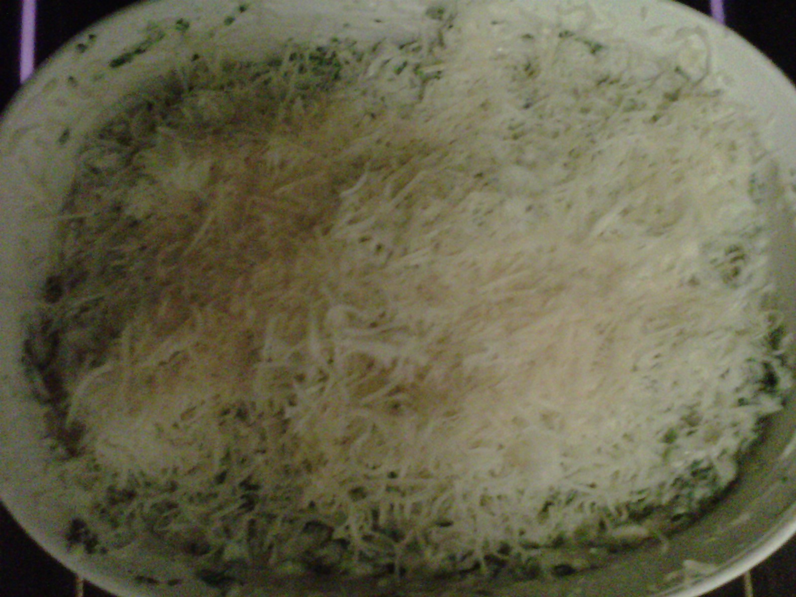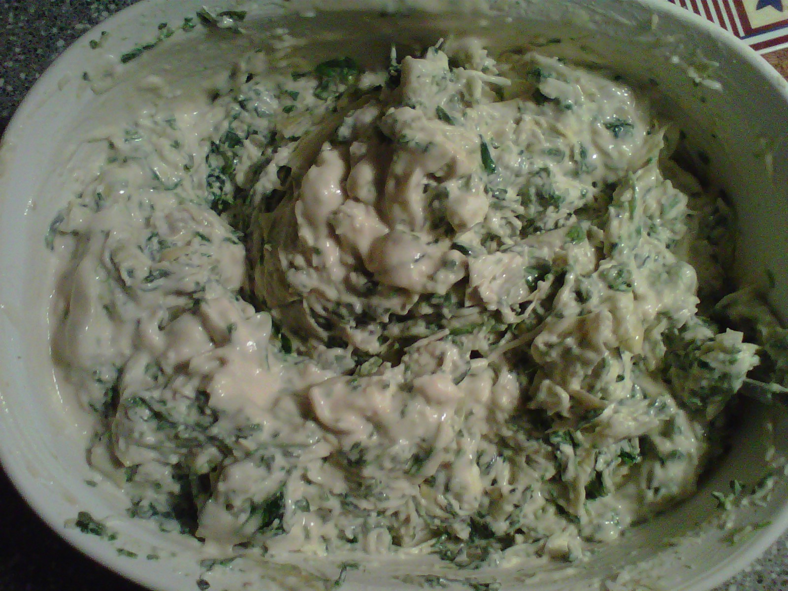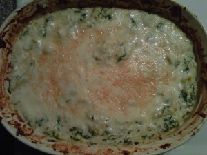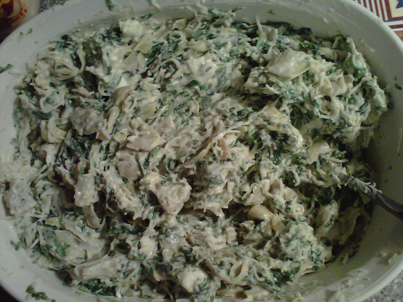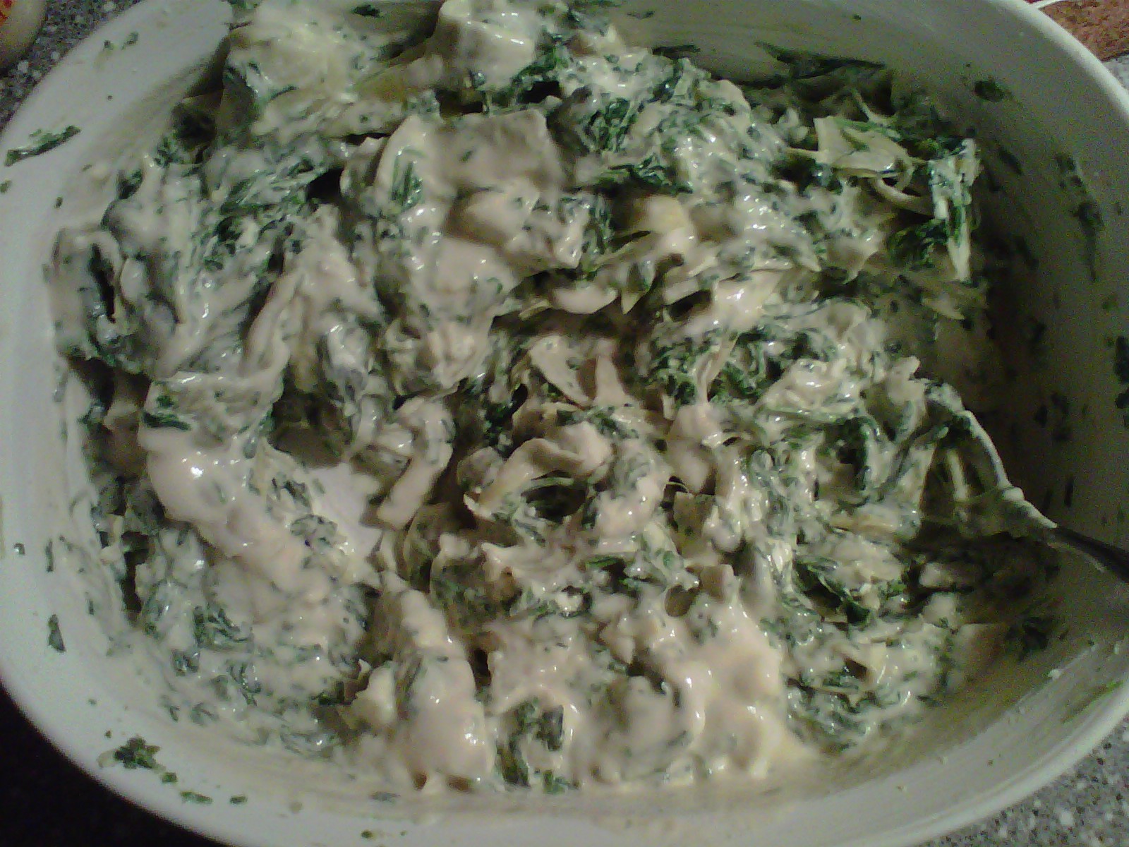 Heat spinach and artichoke quarters according to directions, then place in a casserole dish (unless you can use it to warm both up in the microwave). Be sure to break up the artichoke hearts/quarters with the end of your spoon after cooking. We don’t want the pieces to be too big.