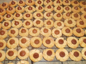 I’m also a bargain hunter. After the holidays, certain things go on sale like Hershey’s Kisses in holiday wrappers, holiday M&Ms, nuts, marshmallow crème, and different flavored chips. One of my clearance sale finds was mini Hershey’s Kisses. The package had a recipe on the back to make Peanut Butter Blossoms. These turned out to be the favorite cookies I shipped to Iraq.